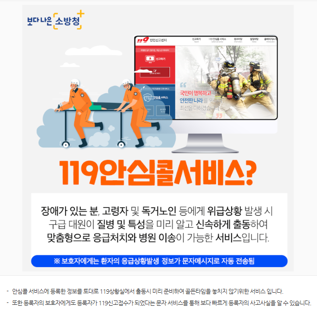 혼자 생활하는 어르신들은 응급 상황에서 도움을 요청하기 어려운 경우가 많습니다. 119안심콜서비스에 등록하면 응급 상황 시 구조대가 필요한 정보를 미리 알고 신속히 대처할 수 있습니다.