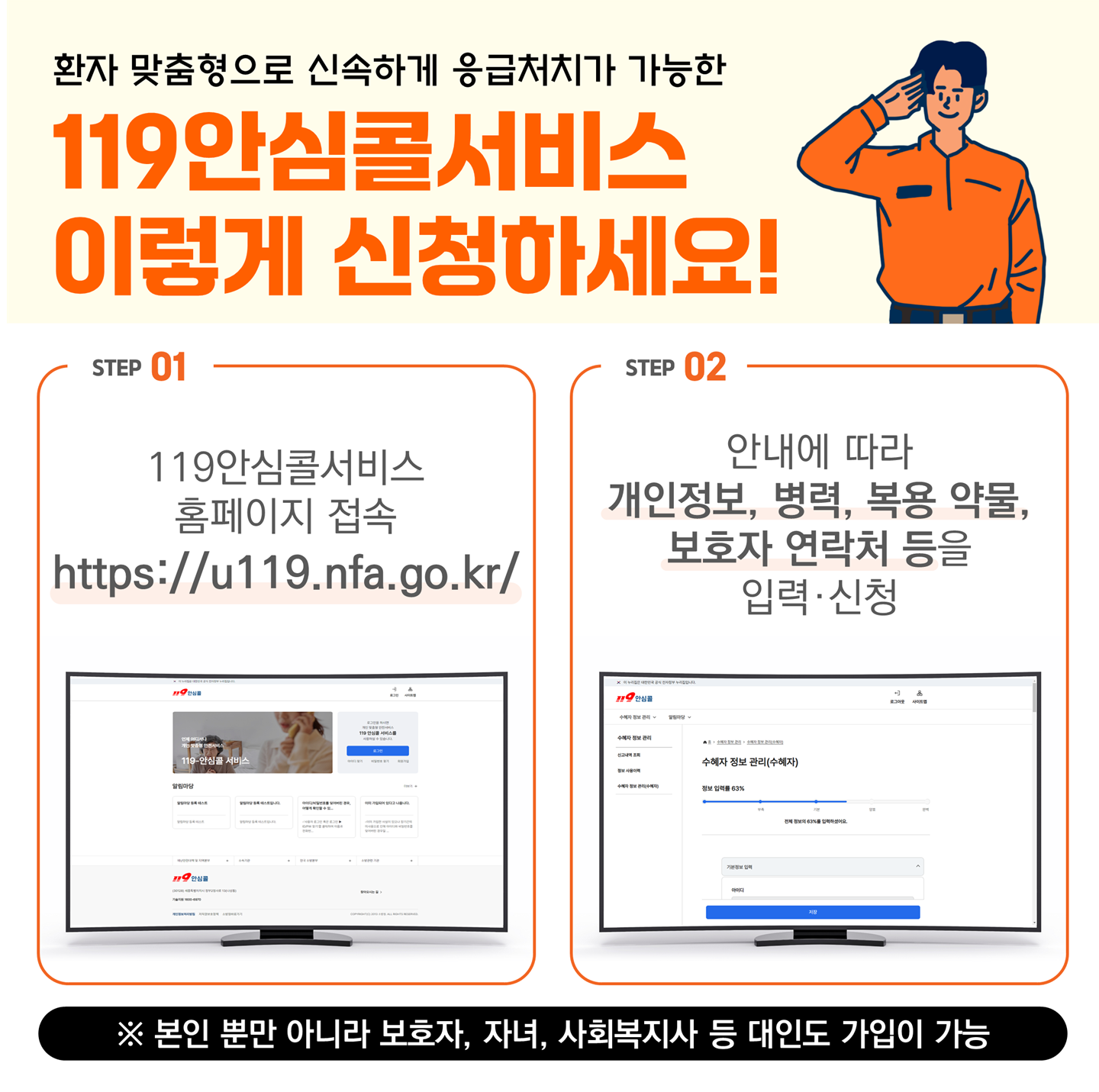 등록된 정보를 바탕으로 구조대가 현장 도착 전부터 상황을 파악하여 더 적절한 응급조치를 할 수 있습니다.