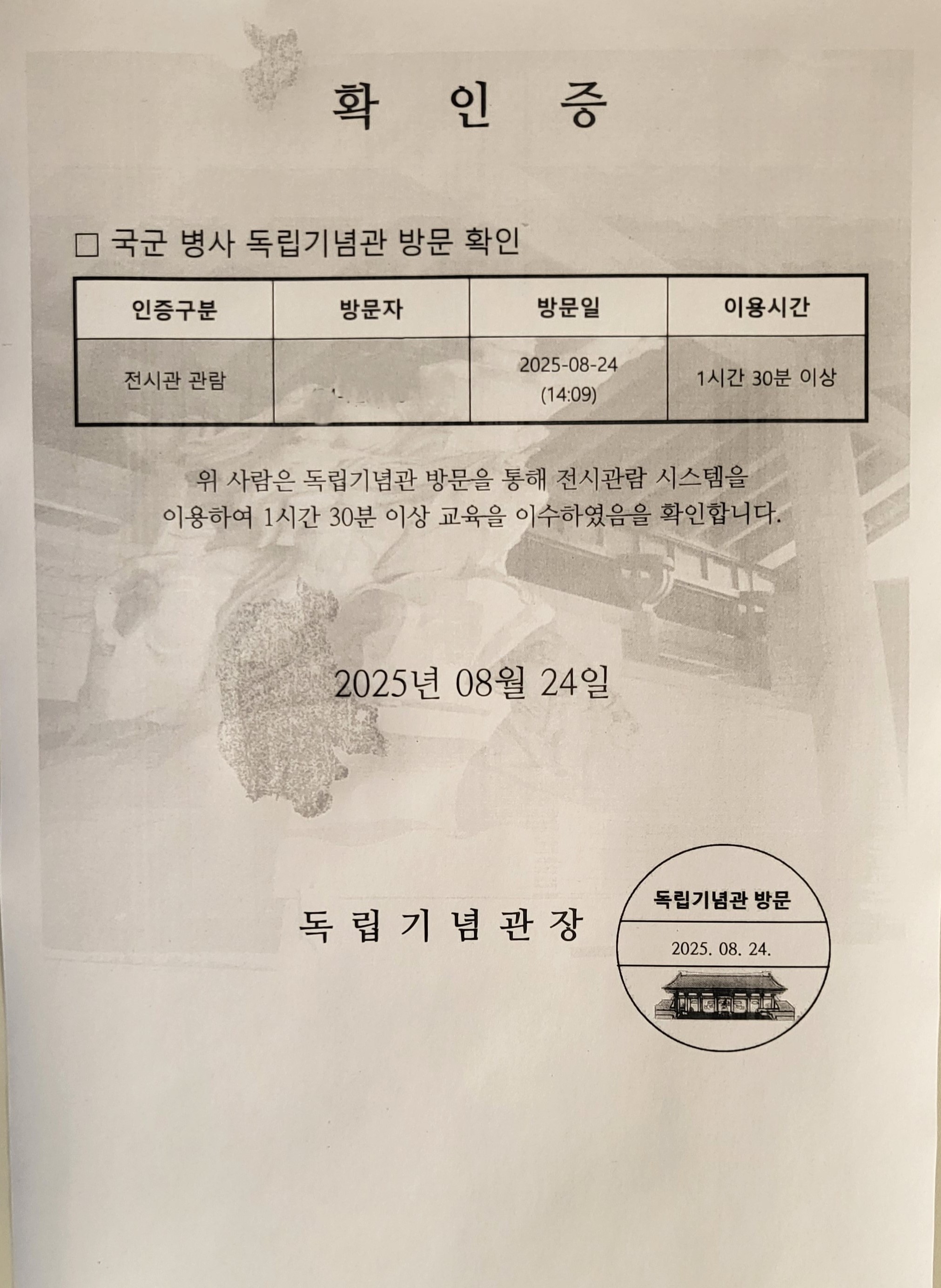 관람을 마치고 나면 방문 확인증이 발급됩니다. 이 확인증은 프로그램 참여를 증명하는 자료로, 이후 휴가 보상에 활용됩니다.