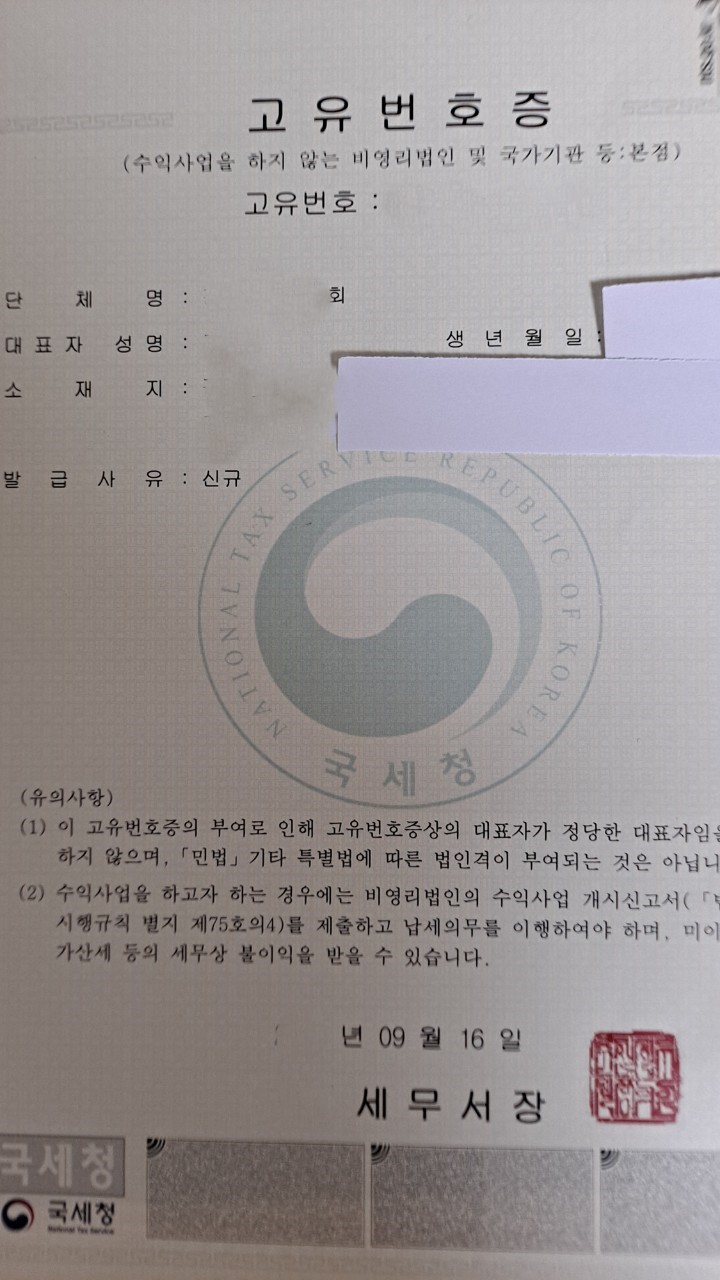 고유번호는 은행 계좌 개설 기부금 영수증 발급 세무 신고 기타 공식적인 행정 절차 등에 활용됩니다.
