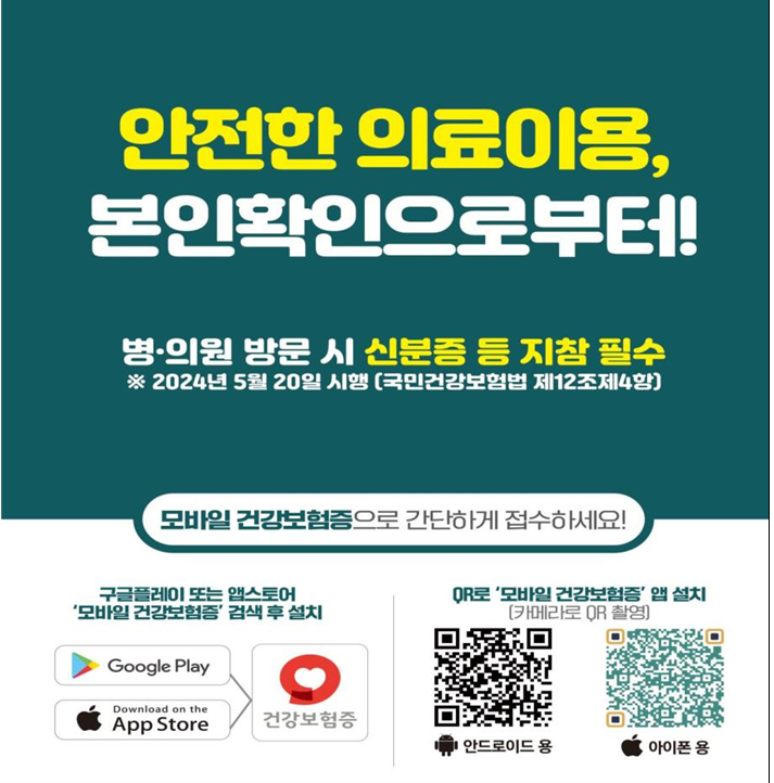 2024년 5월 20일 국민건강보험법 제12조 제4항에 따라 병․의원 방문 시 신분증 등 지참으로 본인 확인이 필수가 되었다.