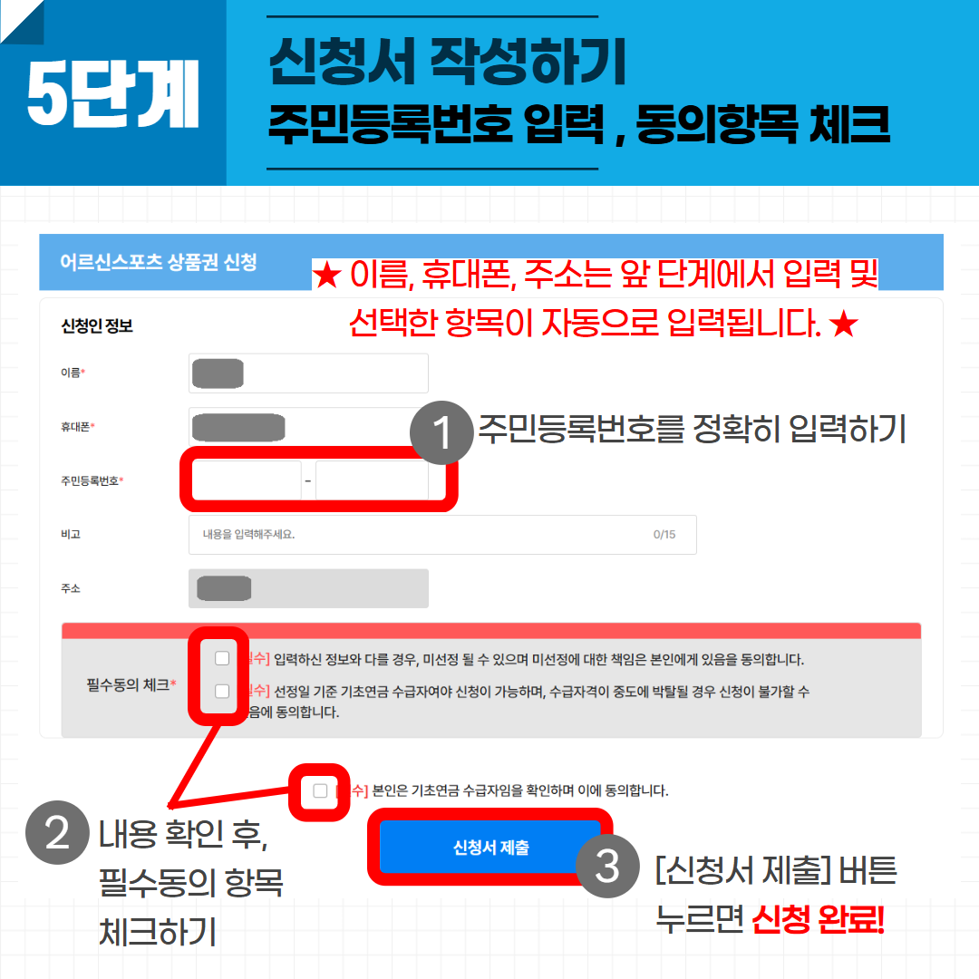 - 주민등록번호, 이름, 휴대폰 번호 확인 후 제출