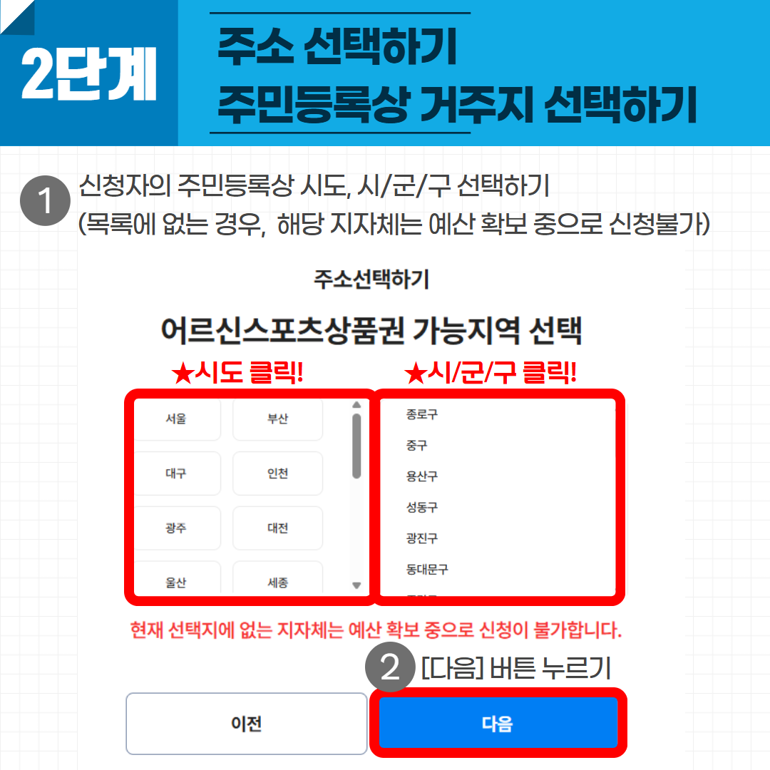 - 주민등록증에 적힌 주소(시/군/구)를 선택