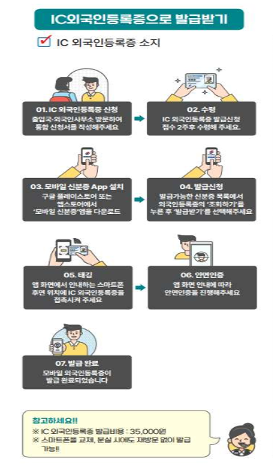 IC 칩이 내장된 신형 외국인등록증 소지자는 새로운 스마트폰에 앱을 설치하고 동일한 절차로 재발급받을 수 있습니다.