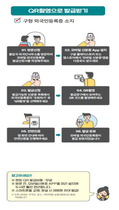 기존 외국인등록증 소지자는 다시 출입국·외국인 관서를 방문하여 QR 코드를 발급받아야 합니다.