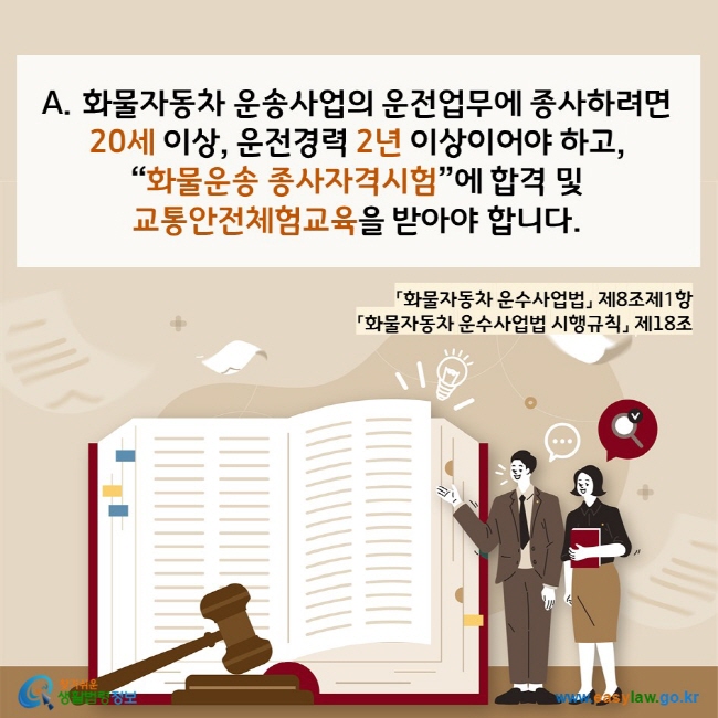 화물자동차 운수사업의 운전업무에 종사하려는 사람은 갖추어야 할 요건(「화물자동차 운수사업법」 제8조, 규제「화물자동차 운수사업법 시행규칙」 제18조 및 제18조의 2 제1항 및 제2항).