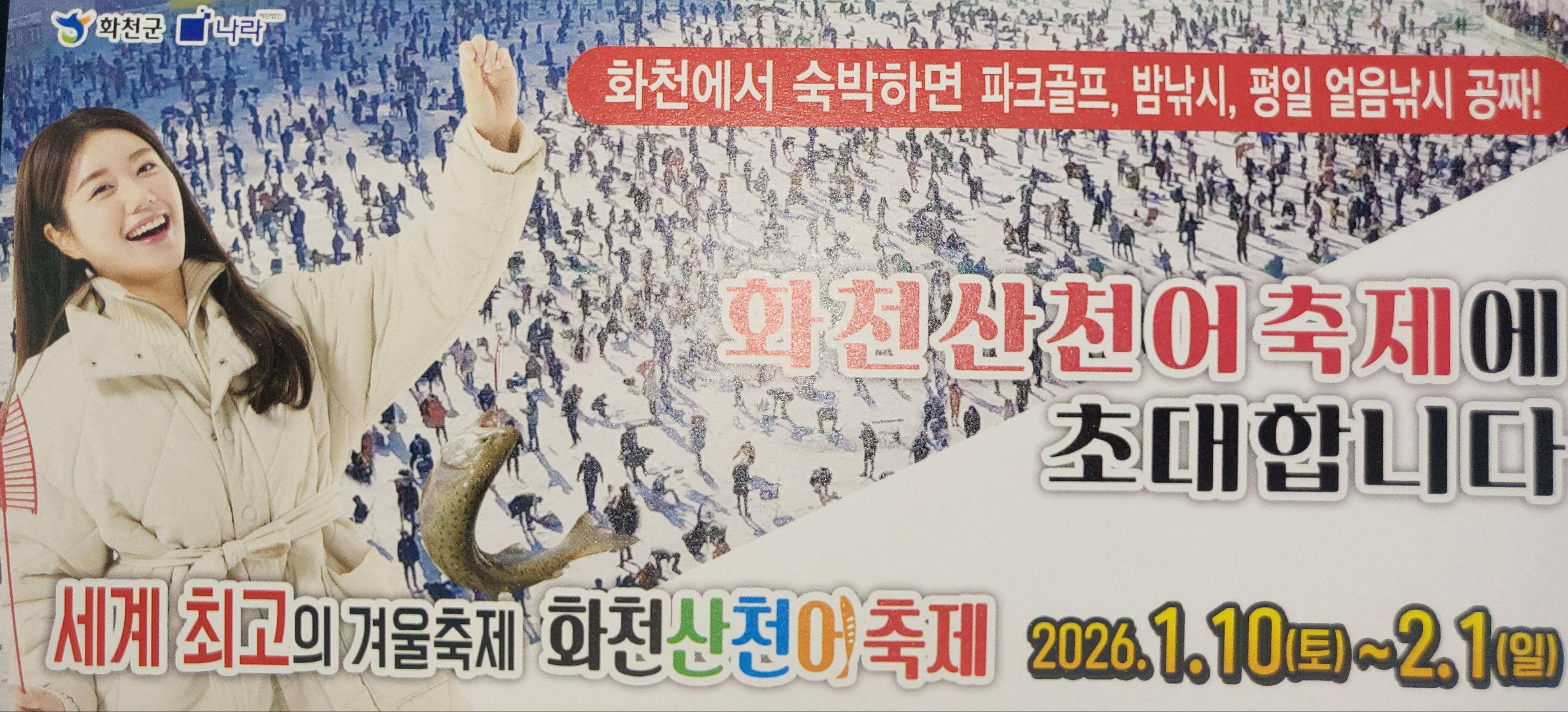 겨울의 낭만, 산천어와 함께하는 특별한 하루 수많은 방문객을 불러 모으는 대한민국 대표 축제 화천 산천어축제는 강원도 화천군에서 열리는 대표적인 겨울 축제입니다. 2026년에는 1월 10일(토)부터 2월 1일(일)까지 총 23일간 개최될 예정입니다. 낚시, 먹거리, 다양한 체험까지 알차게 준비된 축제를 더욱 즐겁고 안전하게 즐길 수 있도록 체험 팁과 정보를 정리해 봤습니다.