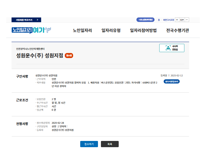 ④ 원하는 일자리 정보 클릭 → ⑤일자리 세부정보 확인후 접수하기 클릭