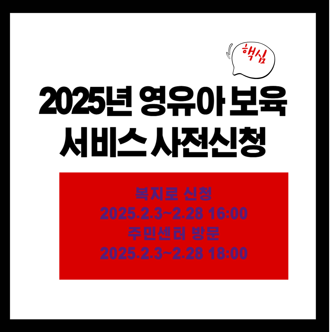 보육서비스 사전신청은 2025년 3월부터 혜택을 받을 수 있도록 미리 신청하는 제도입니다. 해당 지원금을 신청하면 보육시설 이용 시 보육료 지원을 받을 수 있고, 가정 양육 시 양육수당을 받을 수 있습니다.